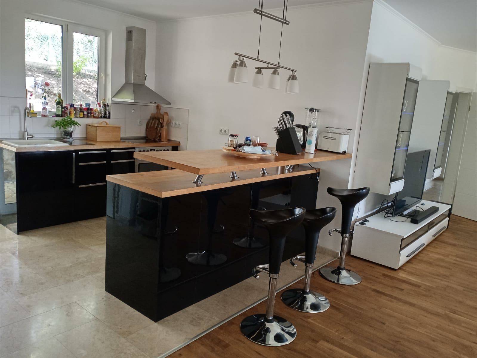 Die Villa hat eine große Küche, die sich zum Wohnzimmer hin mit einer Bartheke öffnet.
